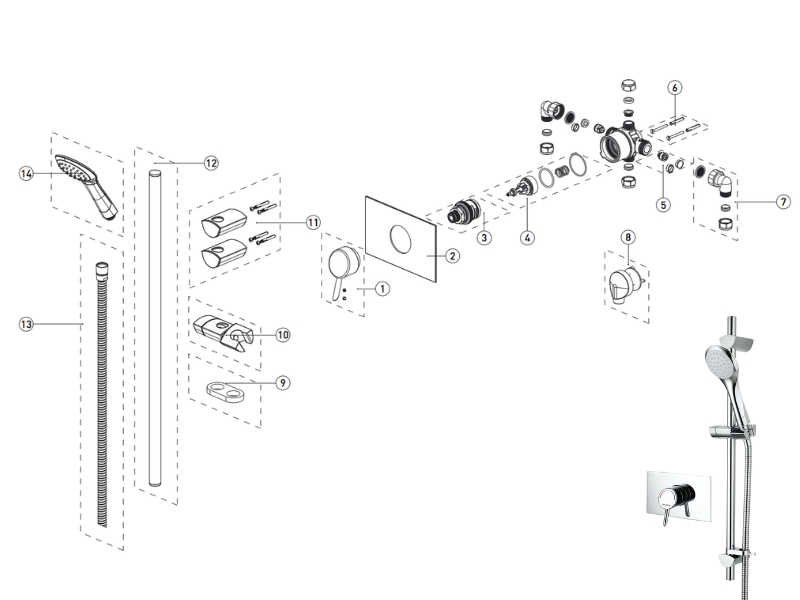 Use the main diagram to identify the shower spare(s) you need to replace. Then use the table below to locate your relevant part(s).