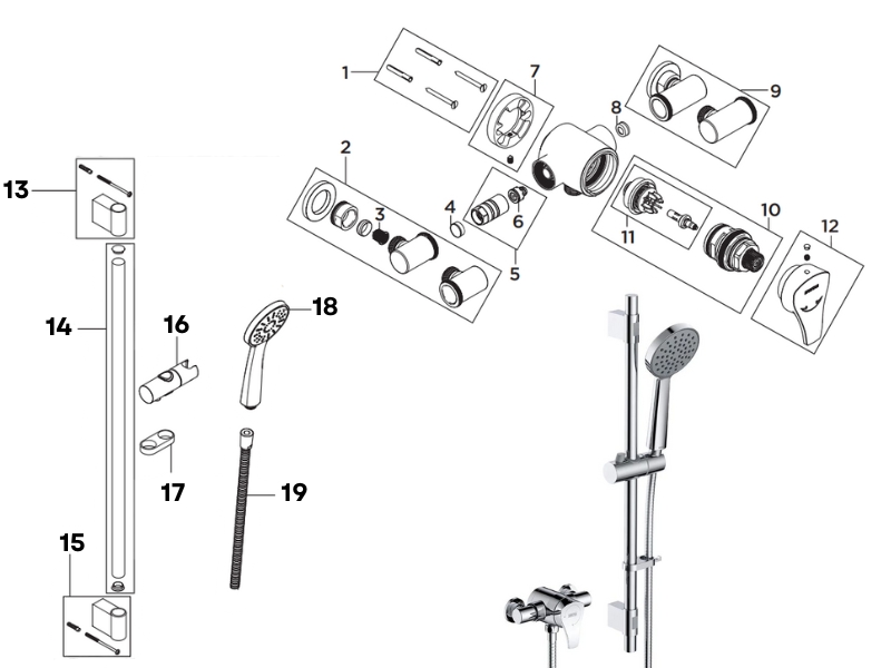 Use the main diagram to identify the shower spare(s) you need to replace. Then use the table below to locate your relevant part(s).