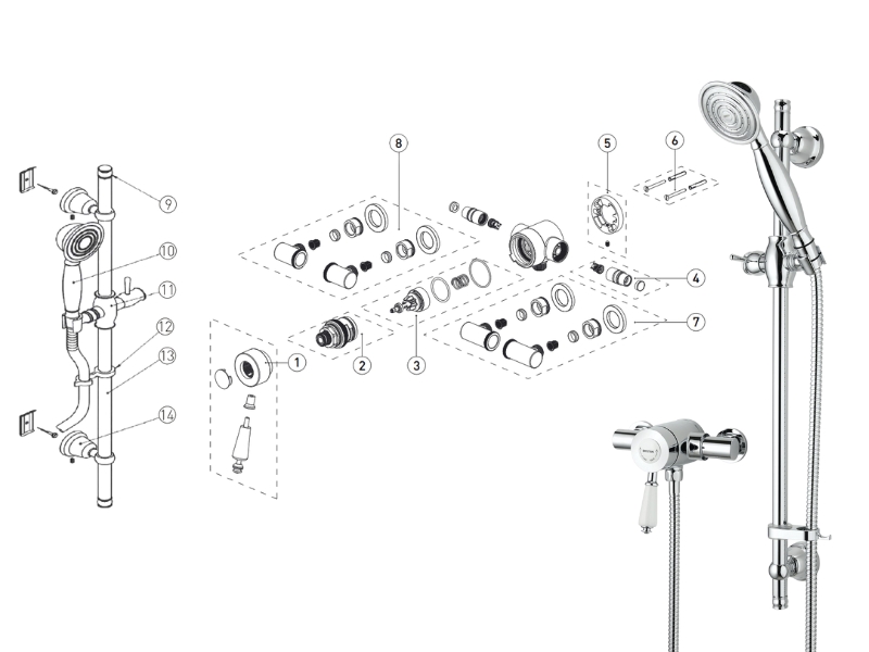 Use the main diagram to identify the shower spare(s) you need to replace. Then use the table below to locate your relevant part(s).