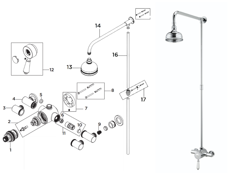 There are 13 currently available spares for the Bristan Colonial Exposed Mini Valve Shower with Rigid Riser (KN2 SHXRR C).