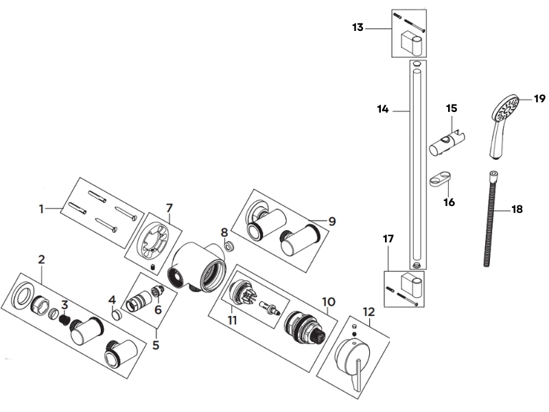 Use the main diagram to identify the shower spare(s) you need to replace. Then use the table below to locate your relevant part(s).
