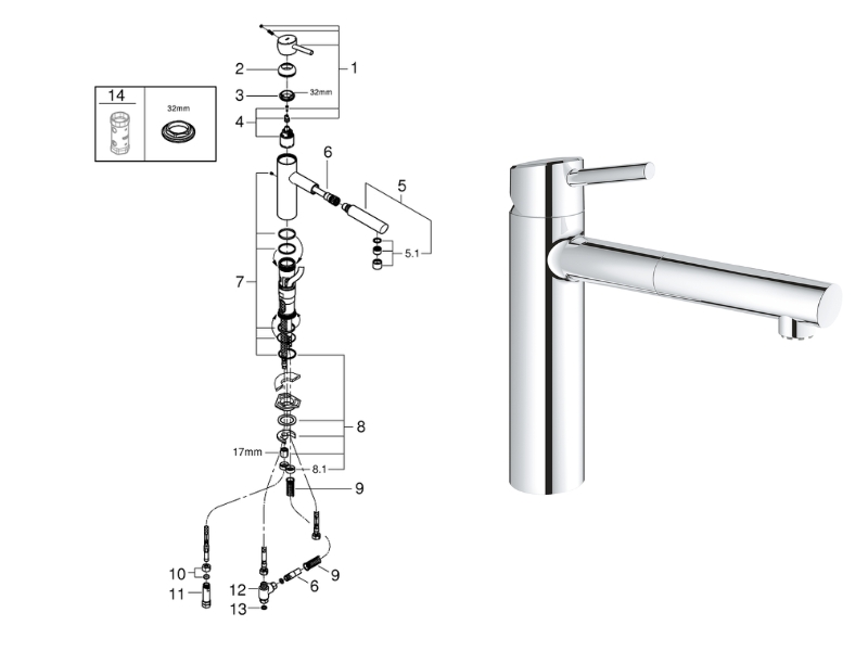 All available replacement spare parts to fit the Grohe Concetto Pull Out Kitchen Tap 1/2" - Chrome (31214001).