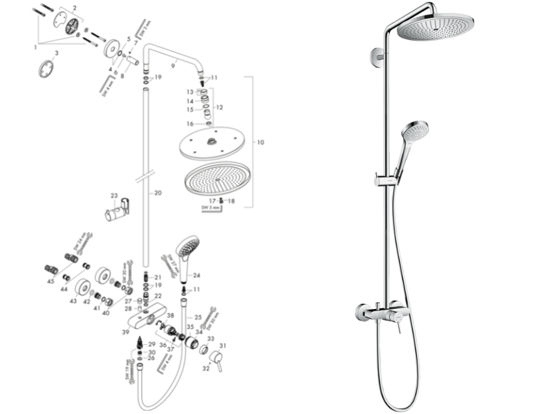 There are 34 currently available spares for the hansgrohe Croma Select S Showerpipe 2801jet Manual Mixer Shower (26791000).