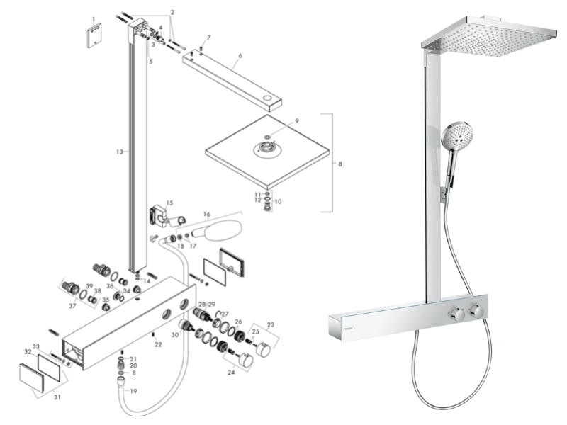 There are 19 currently available spares for the hansgrohe Raindance E 1jet EcoSmart Showerpipe 300 with ShowerTablet 600 Mixer Shower (27364000).