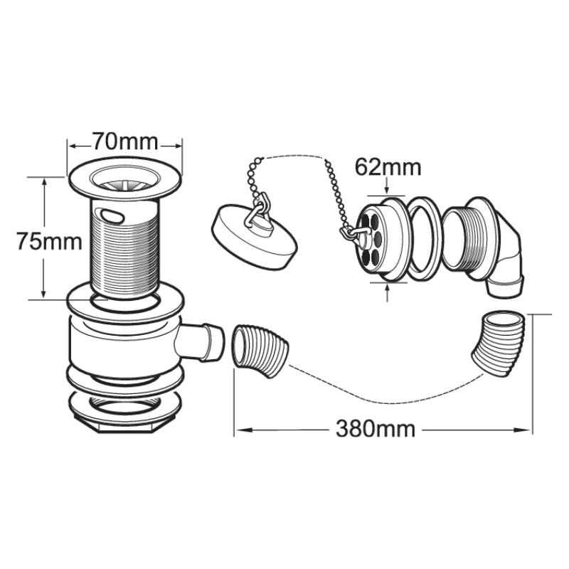 This Deva 1.5" Brass Bath Waste With Brass Plug comprises of a chrome plated brass waste with a chrome plated plastic overflow and a black plastic waste pipe.
