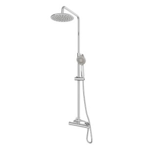 A dual outlet bar type mixer shower connected by stainless steel hose to an adjustable, round handset with 3 spray patterns that sits in a push button holder for variable height adjustment on a stainless steel rail. A simple lever operation at the base of the shower column diverts water to the generous fixed round deluge head for an alternative drenching shower experience. Thermostatic control gives the user assurance of safe and accurate temperature selection whatever shower outlet is being used. The quality all-chrome finish with 5 year parts and labour guarantee make this shower choice from Gainsborough a flexible all-rounder which is suitable for all approved UK high pressure water systems operating between 1-5 bar pressure.