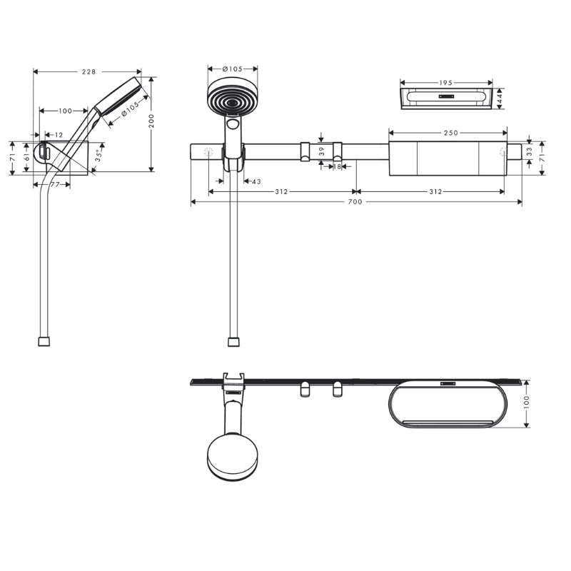 - Consists of: hand shower, shower hose, wall bar, storage basket, towel hook, hand shower holder, squeegee.