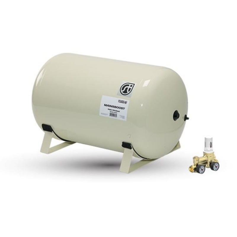 If the incoming mains water pressure is less than 2.5 bar, a MAINSBOOST Charger pump can be used in conjunction with the MAINSBOOST vessel system to boost pressure.The MAINSBOOST MB 200SH-1 features a nominal vessel size of 200 litres and a pressurised cold water water storage capacity of approximately 110 litres.