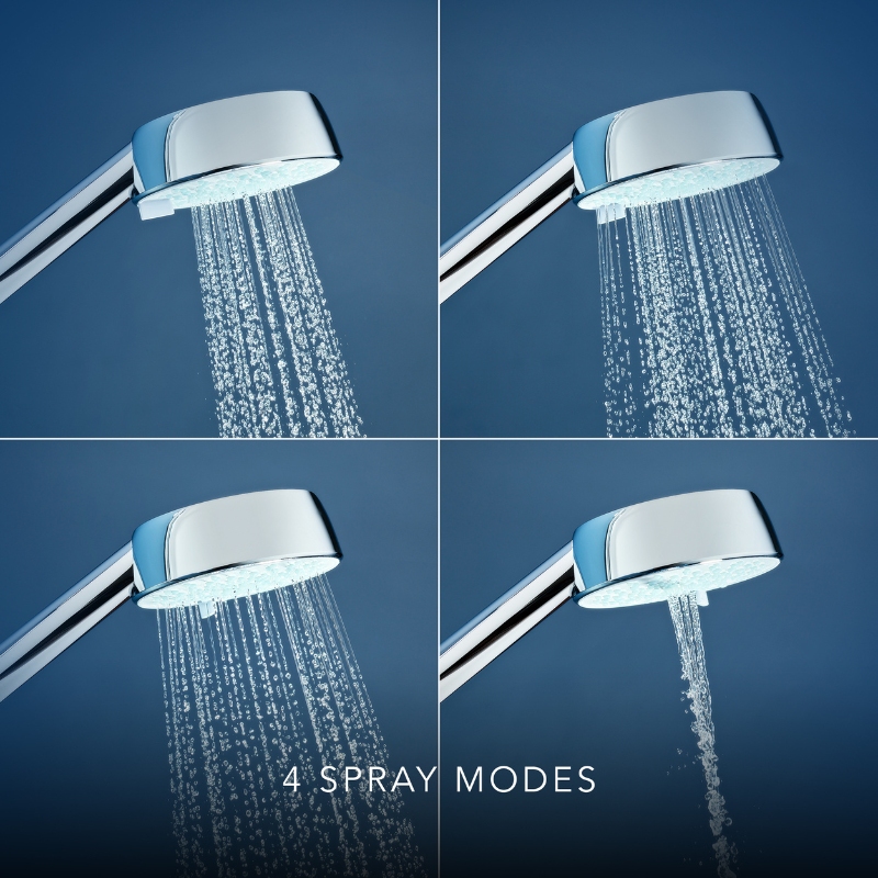 - Flip between four unique, optimised spray modes on the 120 mm handset – ranging from full coverage to a powerful massage spray.