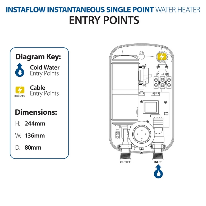 A compact designed unit great for under sink installations as a space saving option and ideal for handwashing. It will provide instantaneous hot water to a single outlet tap (not thermostatic).