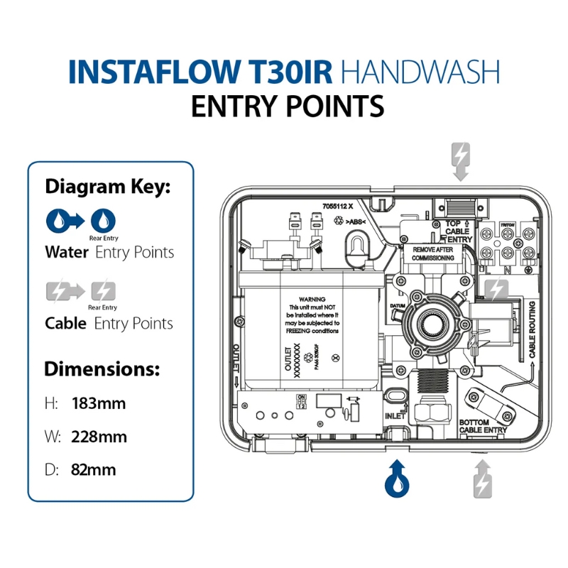 With all the great features of the manual Instaflow T30i handwash, the T30IR provides the additional benefit of handsfree operation with the Infra-red (IR) sensor, ensuring hygienic conditions can be maintained. A compact unit, T30IR is perfect for fitting into small spaces and providing a source for instant hot water where only a cold mains water supply is available. Ideal for a cloakroom, toilet with no hot water supply, utility room or commercial environment such as a workshop or garage.