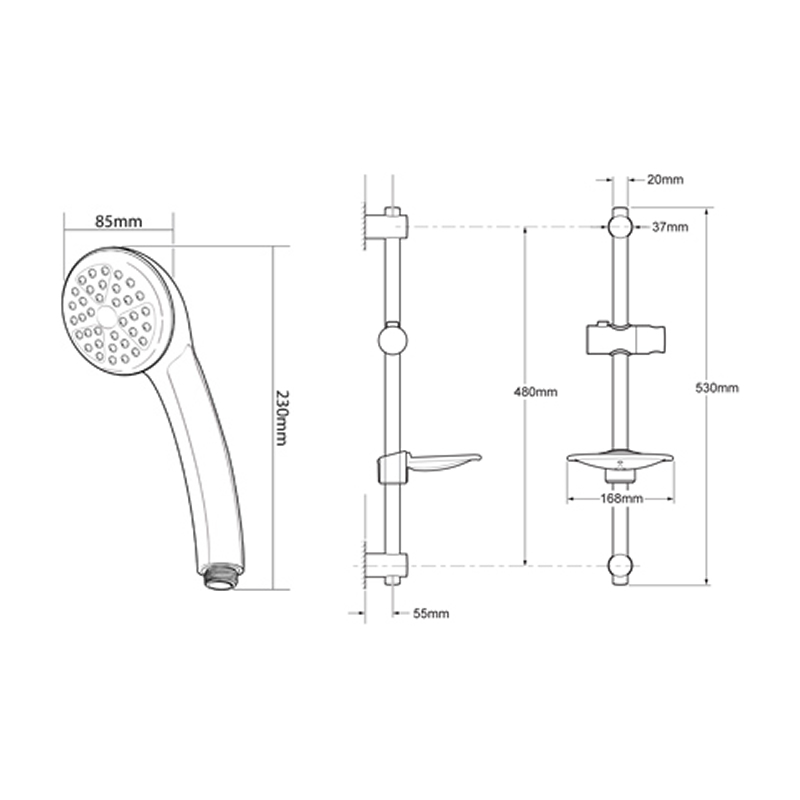 - Supplied with Triton Aimee accessories and Triton David fittings: 1.25m shower hose (chrome), single-spray shower head (white), 530mm riser rail (chrome), rail end brackets (white), clamp bracket assembly (white), and soap dish (white).
