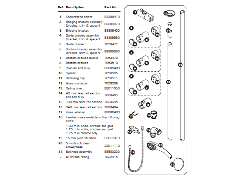Use the main diagram to identify the shower spare(s) you need to replace. Then use the table below to locate your relevant part(s).